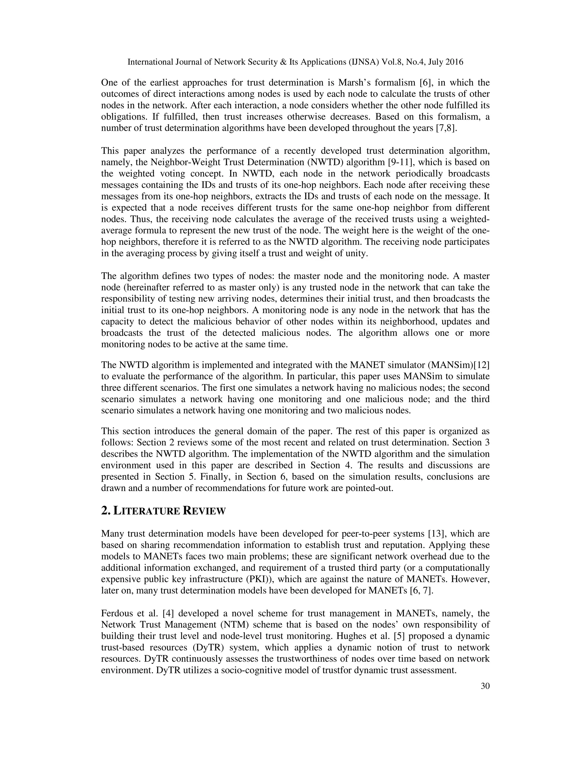 The paper analyzes the Neighbor-Weight Trust Determination (NWTD) algorithm designed for Mobile Ad-Hoc Networks (MANETs) to effectively detect and isolate malicious nodes. Through simulation using the MANET simulator (MANSIM), the NWTD algorithm shows reliability in trust determination by averaging the trust levels of one-hop neighbors and employing master nodes for assessing new node trustworthiness. Results indicate it's a promising mechanism for enhancing the security and stability of MANETs against attacks from malicious nodes.
