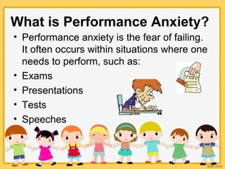 Performance anxiety is the fear of failing in situations like exams and presentations, leading to cognitive, physical, and behavioral symptoms. It affects not only academic performance but also social relationships and overall well-being, with high rates observed in contexts like school and among certain demographics. Effective interventions include cognitive-behavioral therapy (CBT) and school-wide strategies that foster early identification and support for students facing anxiety.