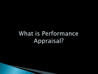 Performance appraisal refers to evaluating employees' performance, personality, and potential. It is a systematic process that examines strengths and weaknesses through objective assessments against defined benchmarks. The document then discusses various methods of performance appraisal, including rating scales, critical incident reports, management by objectives, psychological evaluations, and 360-degree feedback, highlighting their advantages and disadvantages.