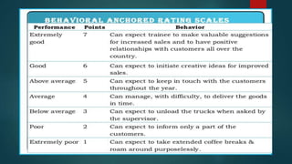 The document discusses various methods of performance appraisal used to evaluate employees. It describes past-oriented methods like rating scales, checklist methods and forced choice methods. Future-oriented methods discussed include management by objectives, psychological appraisal, assessment centers, and 360-degree feedback. Key factors measured in performance appraisals are listed as job knowledge, quality and quantity of work, initiative, and dependability. The purposes of performance appraisal are identified as communication of performance, training and development, and determining effectiveness of HR programs.