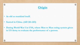 The document discusses the history, definition, objectives, and essential elements of performance appraisal, which evaluates employee job performance systematically and impartially. It outlines a six-step process for conducting appraisals, including establishing performance standards and measuring actual performance against these standards. Factors influencing appraisals, such as evaluator biases and employee loyalty, as well as types of corrective actions, are also addressed.