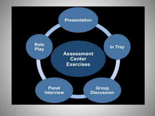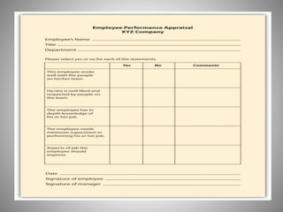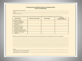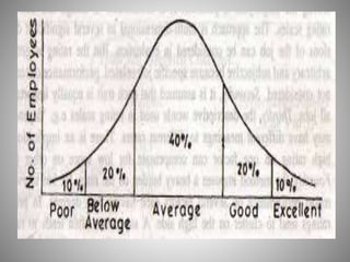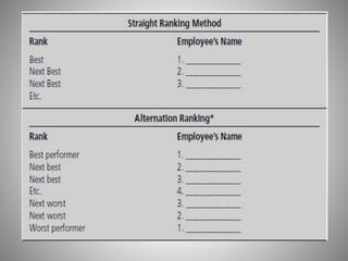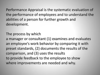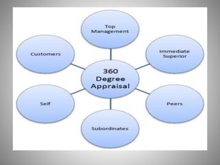 The document provides an overview of various performance appraisal methods. It discusses traditional methods like graphic rating scales, checklists, forced distribution, and essays. It also examines modern methods such as management by objectives, 360-degree feedback, psychological assessments, assessment centers, and behaviorally anchored rating scales. The key objectives of performance appraisal are identified as providing feedback, determining compensation, identifying training needs, and assessing potential for growth. A variety of specific appraisal techniques are defined and their advantages/disadvantages explored.