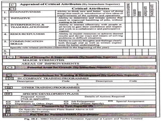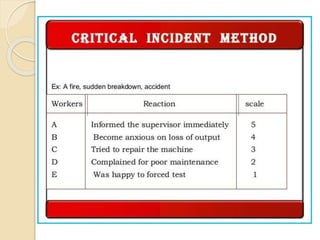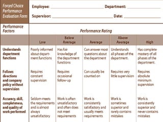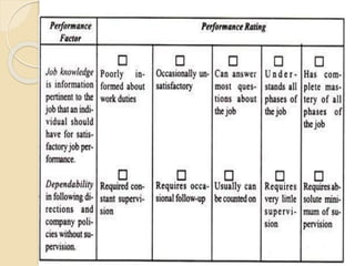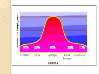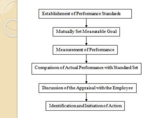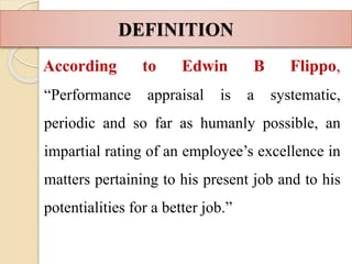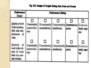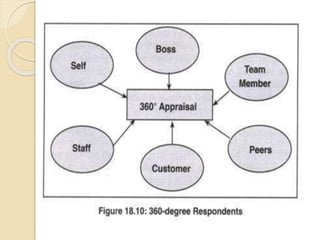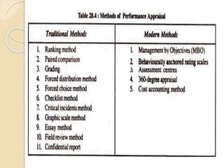 The document outlines the concept, objectives, principles, and methods of performance appraisal, emphasizing its importance in evaluating employee performance for promotions, training needs, and salary decisions. It details various appraisal methods, such as ranking, paired comparisons, and 360-degree feedback, while also noting the challenges and limitations associated with performance appraisal processes. Additionally, it discusses key behaviors for appraisal interviews and potential appraisal problems that can affect the accuracy and effectiveness of evaluations.