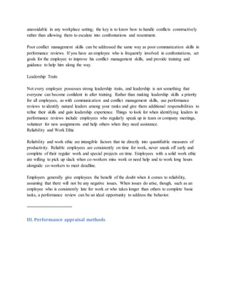This document provides information about performance appraisal communication, including methods, tips, and forms. It discusses evaluating employees' communication skills, conflict management skills, leadership traits, reliability, and work ethic during performance reviews. Several performance appraisal methods are described, such as ranking, rating scales, checklists, critical incidents, essays, and behaviorally anchored rating scales. Other related topics like review phrases, examples, templates, and software are also listed.