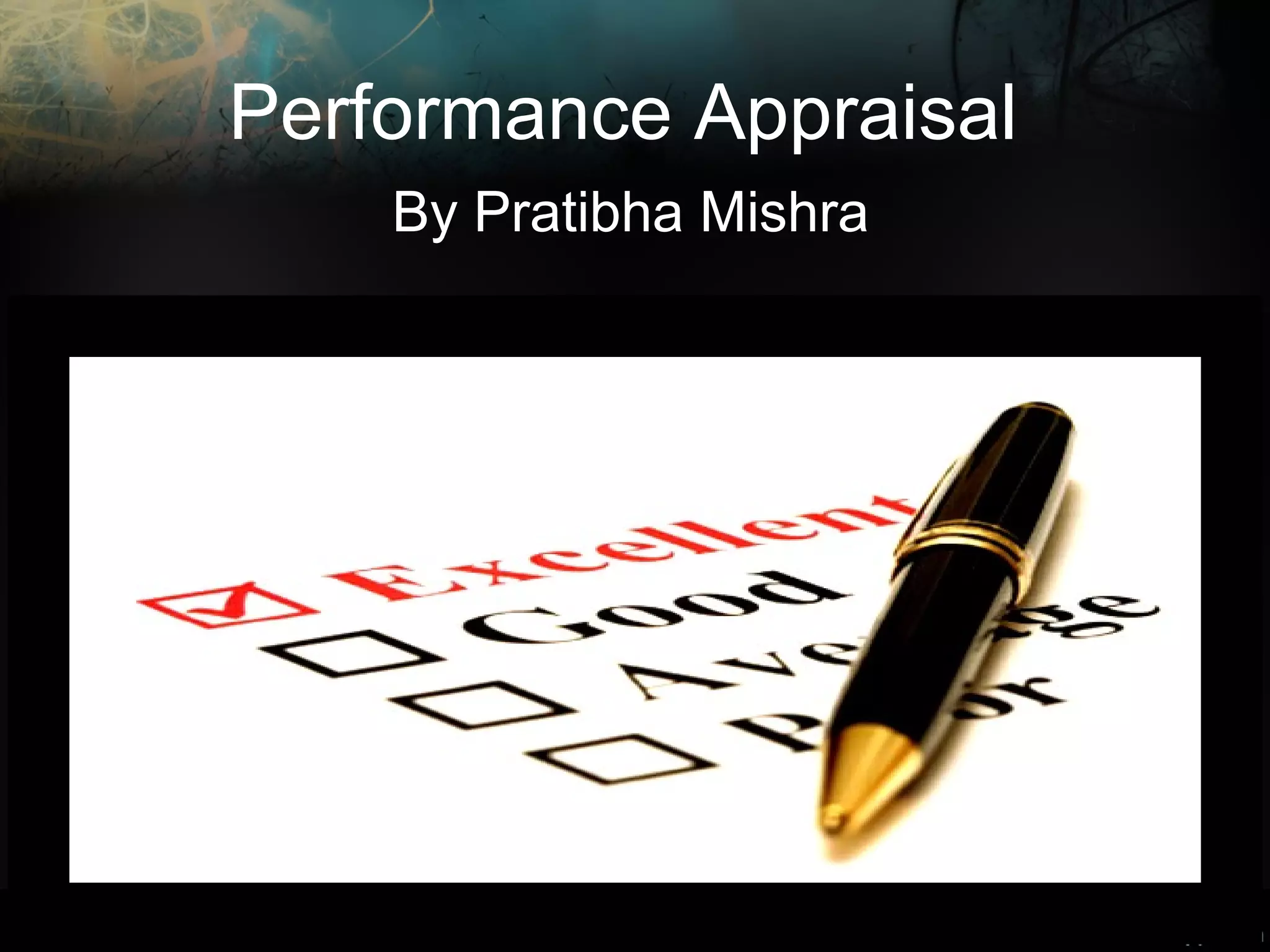 The document discusses the performance appraisal process, defining it as a means of managing individuals by setting clear goals, measuring performance, and providing feedback. It outlines the stages involved in conducting performance appraisals, various evaluation methods, common rating errors, and emphasizes the importance of effective communication and goal setting. The document also covers individual and group evaluation methods, common performance indicators, and the significance of defining 'SMART' goals for employee development.