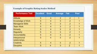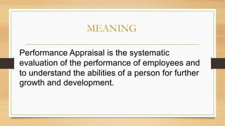 The document discusses performance appraisal, defining it as a systematic evaluation of employee performance and potential for growth. It outlines various objectives and methods of performance appraisal, including both traditional methods like confidential reports and modern methods such as 360-degree feedback. The objective is to maintain employee records, identify strengths and weaknesses, and provide feedback for development.