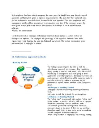 This document provides information about performance appraisal and management. It discusses several important aspects of conducting performance appraisals including identifying employee strengths and weaknesses, reviewing goals achieved, and outlining areas for potential improvement. The document also describes several common methods for conducting performance appraisals such as ranking, rating scales, checklists, critical incidents, essays, and behaviorally anchored rating scales. Finally, it lists additional related topics around performance appraisal processes, forms, examples, and tools.