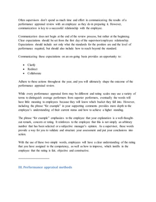 The document provides a comprehensive guide on performance appraisal phrases, methods, and tips for supervisors tasked with evaluating employee performance. It highlights common dissatisfaction among employees regarding performance ratings and emphasizes the importance of clear communication and specific examples during reviews. Various appraisal methods, such as ranking, rating scales, and critical incidents, are discussed along with their advantages and limitations.