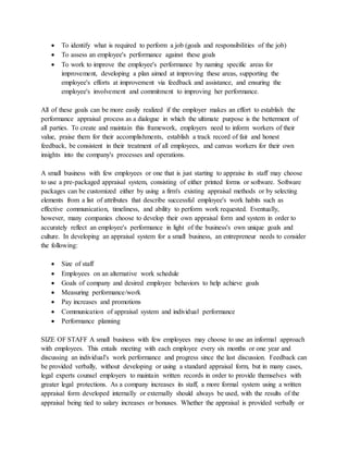 The document outlines various performance appraisal methods, tips, and samples to assist companies in evaluating employee performance effectively. It emphasizes the importance of structured feedback as a developmental tool, detailing the goals and processes for establishing a performance appraisal system, particularly in small businesses. Additionally, it discusses alternative evaluation strategies and the significance of consistent communication and documentation in the appraisal process.