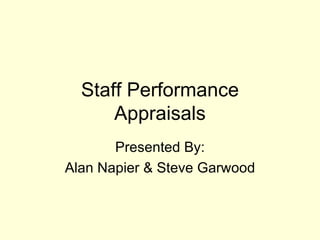The document provides an overview of staff performance appraisals, including why they are conducted, the performance appraisal cycle and form, tips for conducting appraisals, and contract requirements for addressing unsatisfactory work performance. Performance appraisals are used to communicate expectations and feedback, identify training needs, and improve employee performance. The performance cycle involves setting expectations, ongoing feedback, and reviewing performance against expectations. The appraisal form is used to formally evaluate performance against established standards. Contract requirements mandate attempts to correct unsatisfactory work through a corrective action plan before termination can occur.