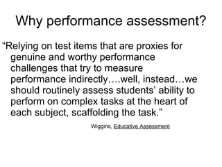 The document discusses performance assessments and provides examples of performance tasks from various grade levels. It discusses the key elements of effective performance tasks, including ensuring they are clearly defined and aligned to learning targets. It also covers constructing rubrics to evaluate performance tasks, including the differences between holistic and analytic rubrics. The importance of providing descriptive feedback on rubrics is emphasized.