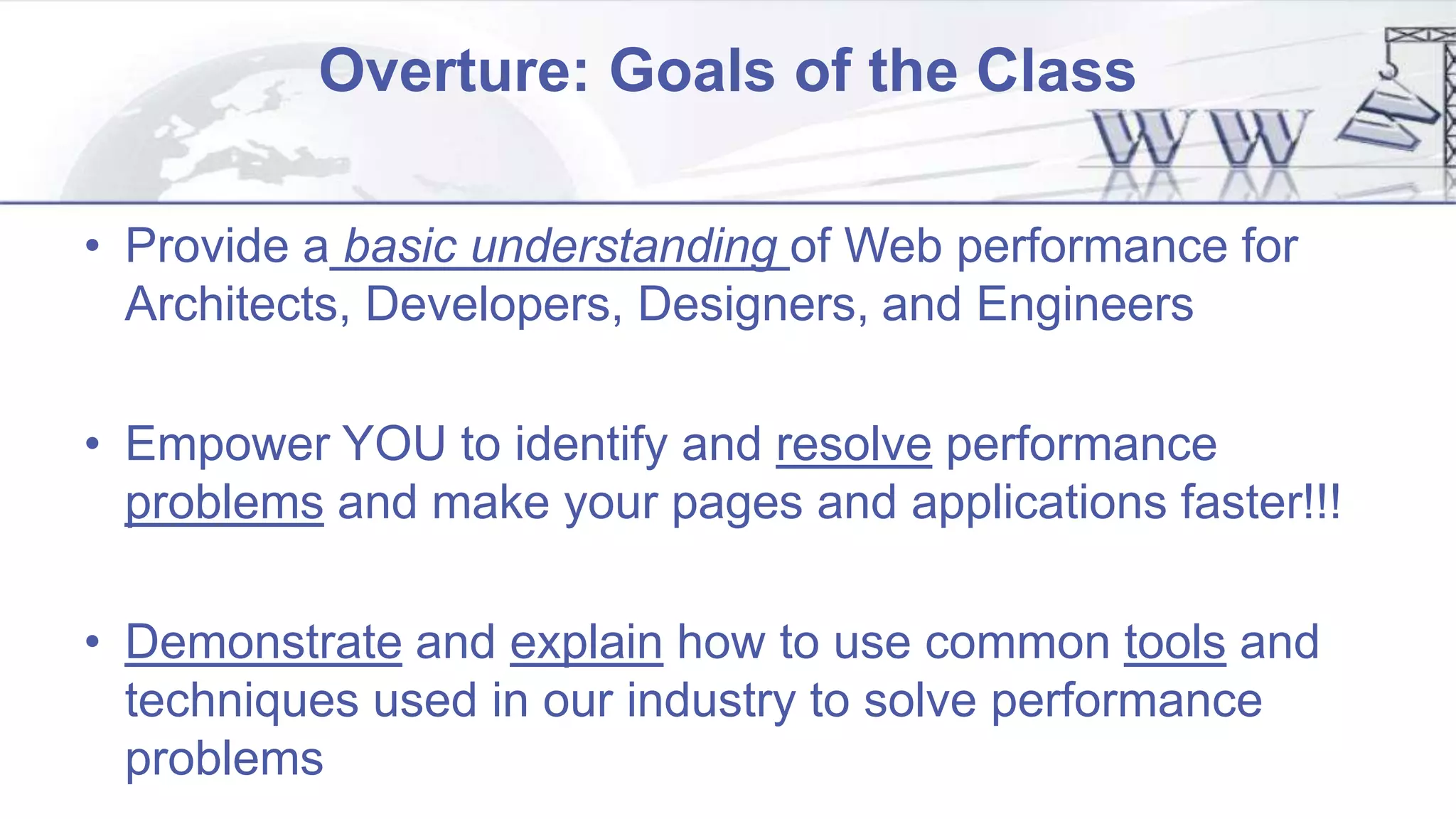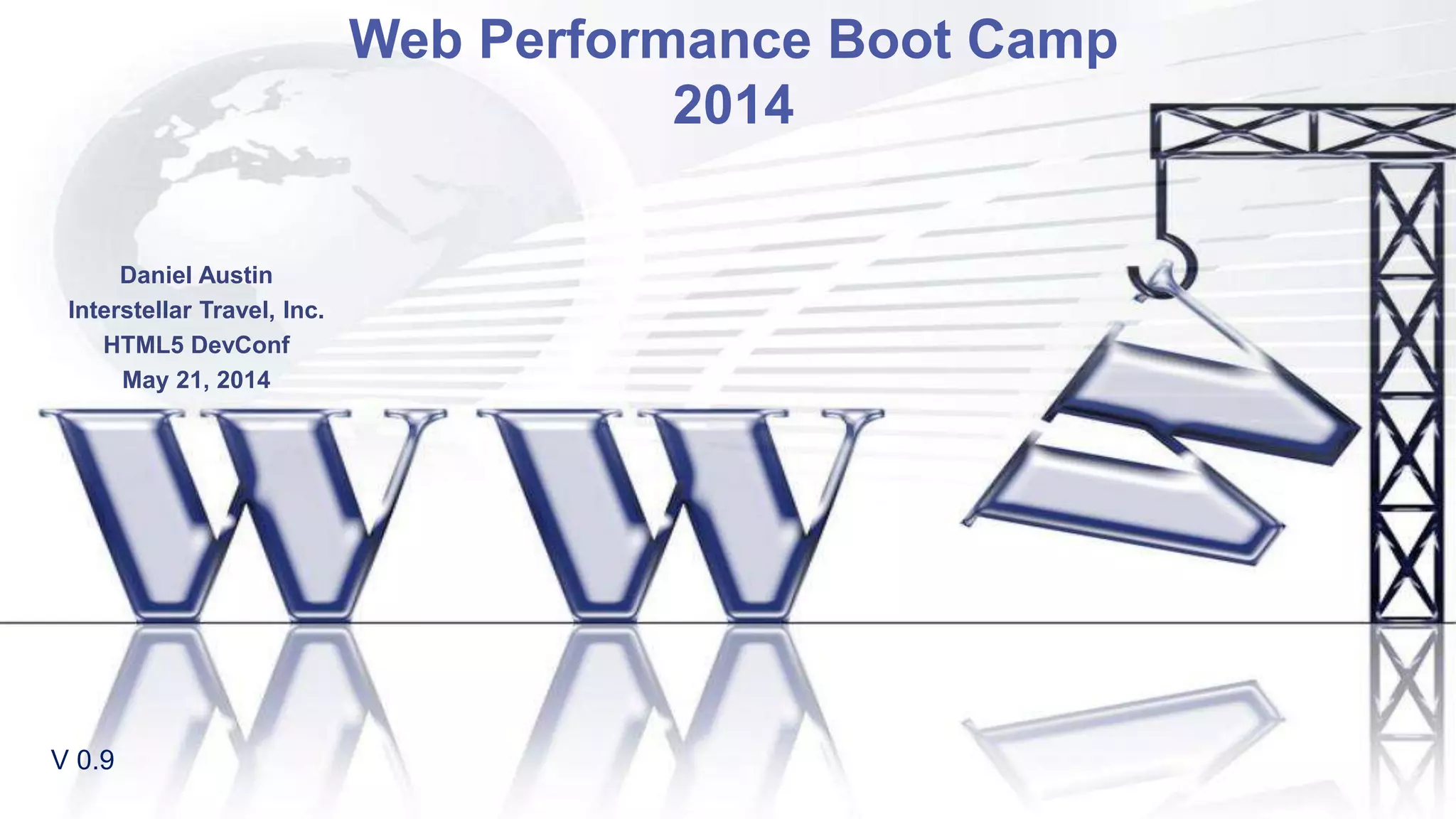 This document provides an overview of a web performance boot camp. The goals of the class are to provide an understanding of web performance, empower attendees to identify and resolve performance problems, and demonstrate common tools and techniques. The class structure includes sections on what performance is, performance basics, the MPPC model of web performance, and tools and testing. Key topics that will be covered include metrics like response time, statistical distributions, Little's Law, the response time equation, and the dimensions that impact performance like geography, network, browser/device, and page composition.