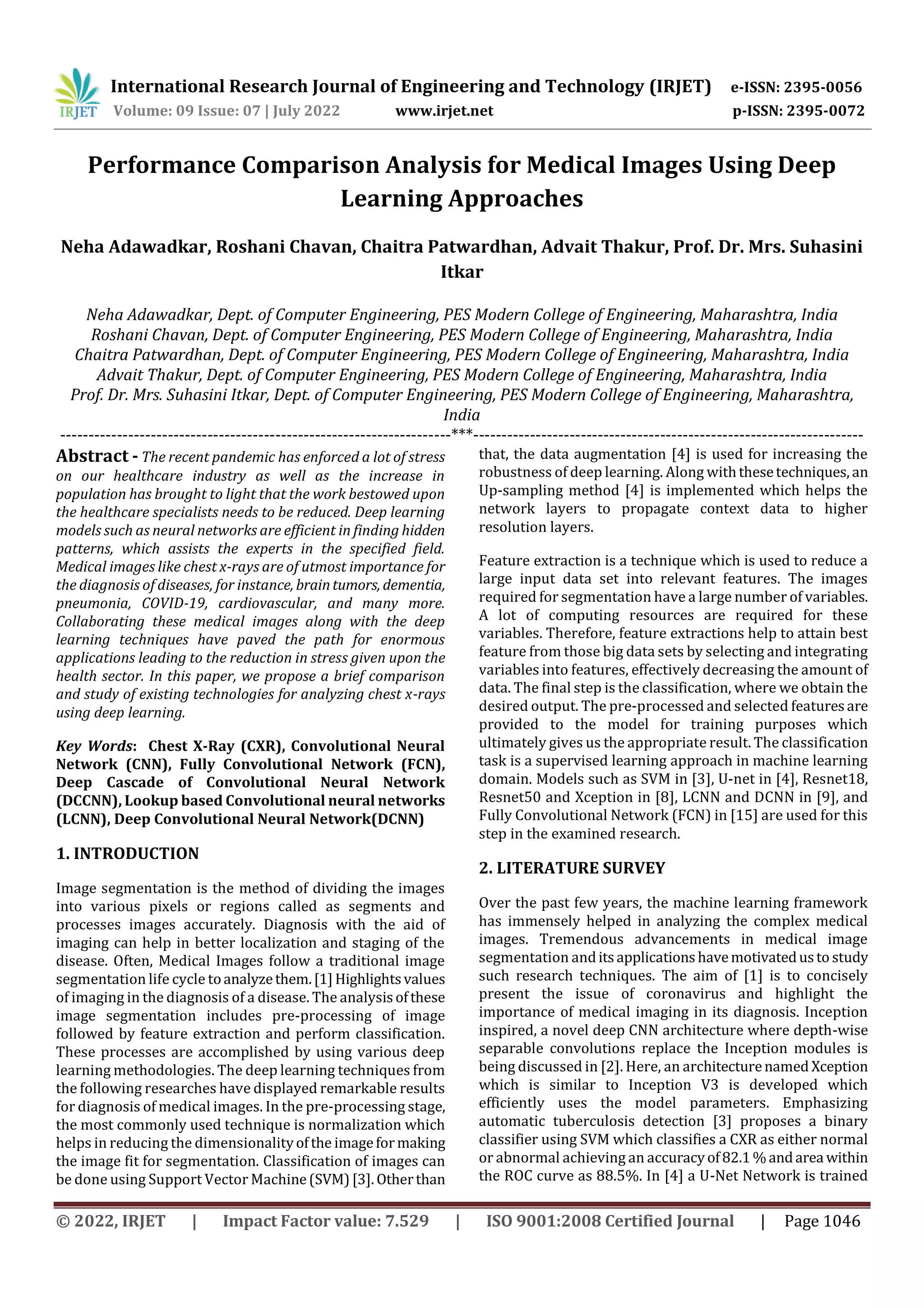 This document discusses and compares several deep learning approaches for analyzing medical images, specifically chest x-rays. It first provides an abstract that outlines comparing existing technologies for analyzing chest x-rays using deep learning. It then reviews literature on models like convolutional neural networks (CNN), fully convolutional networks (FCN), lookup-based convolutional neural networks (LCNN), and deep cascade of convolutional neural networks (DCCNN) that have been applied to tasks like image segmentation, classification, and quality assessment of medical images. The document compares the performance of these models on different medical image datasets based on accuracy metrics.