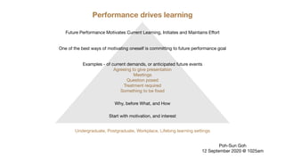The document discusses the relationship between performance and learning, highlighting how future performance goals can motivate current learning efforts. It emphasizes the importance of motivation and interest in various educational and professional contexts. Examples include commitments to future presentations and addressing current demands or challenges.
