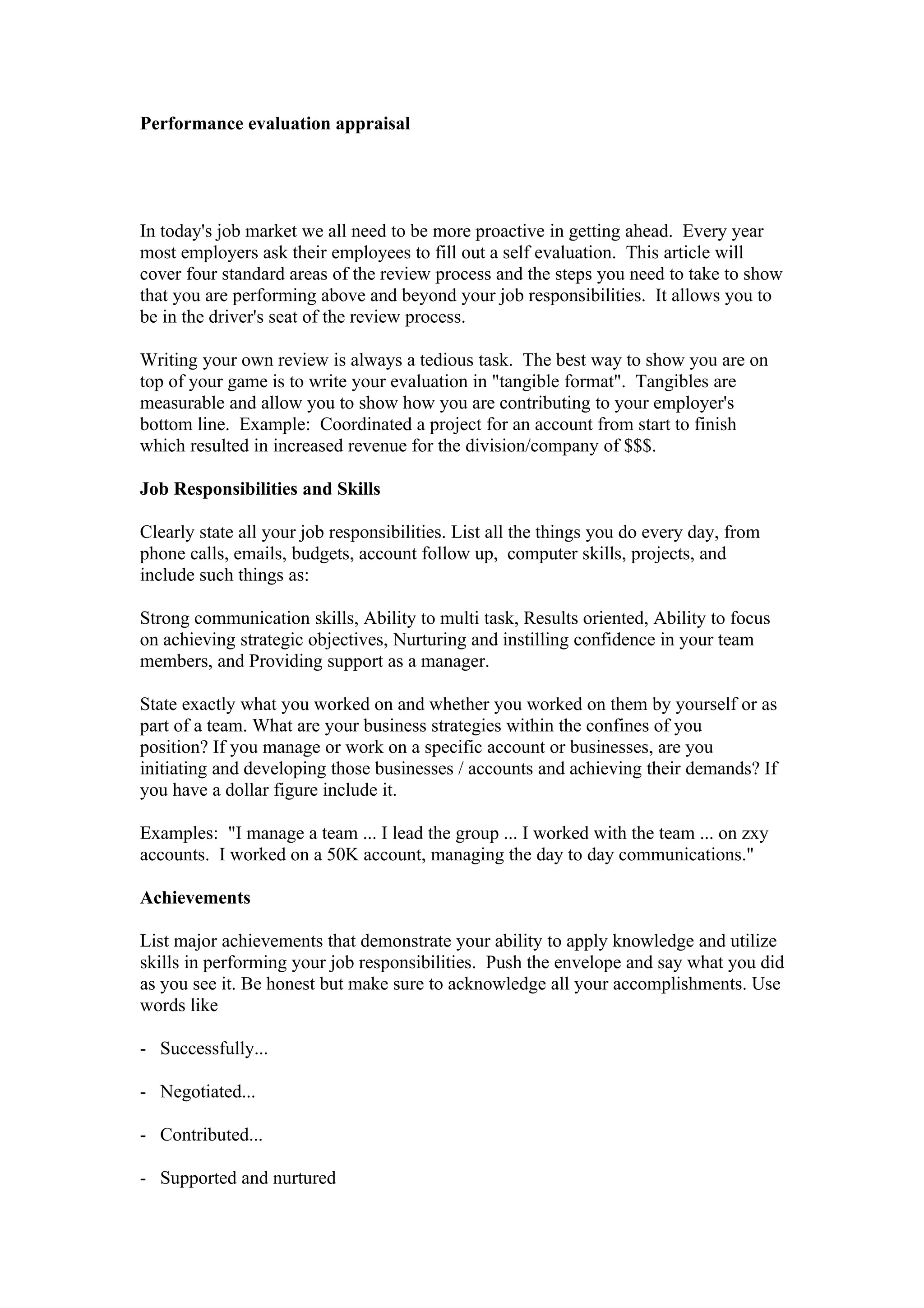 This document provides guidance on how to write an effective self-evaluation for one's annual performance review. It outlines four key areas to address: job responsibilities and skills, achievements, overall performance, and setting goals. For each area, it recommends quantifying accomplishments, using measurable results, and focusing on contributions to the company's bottom line. The overall message is to promote oneself honestly while acknowledging room for growth in order to demonstrate one's value and potential for increased responsibilities.