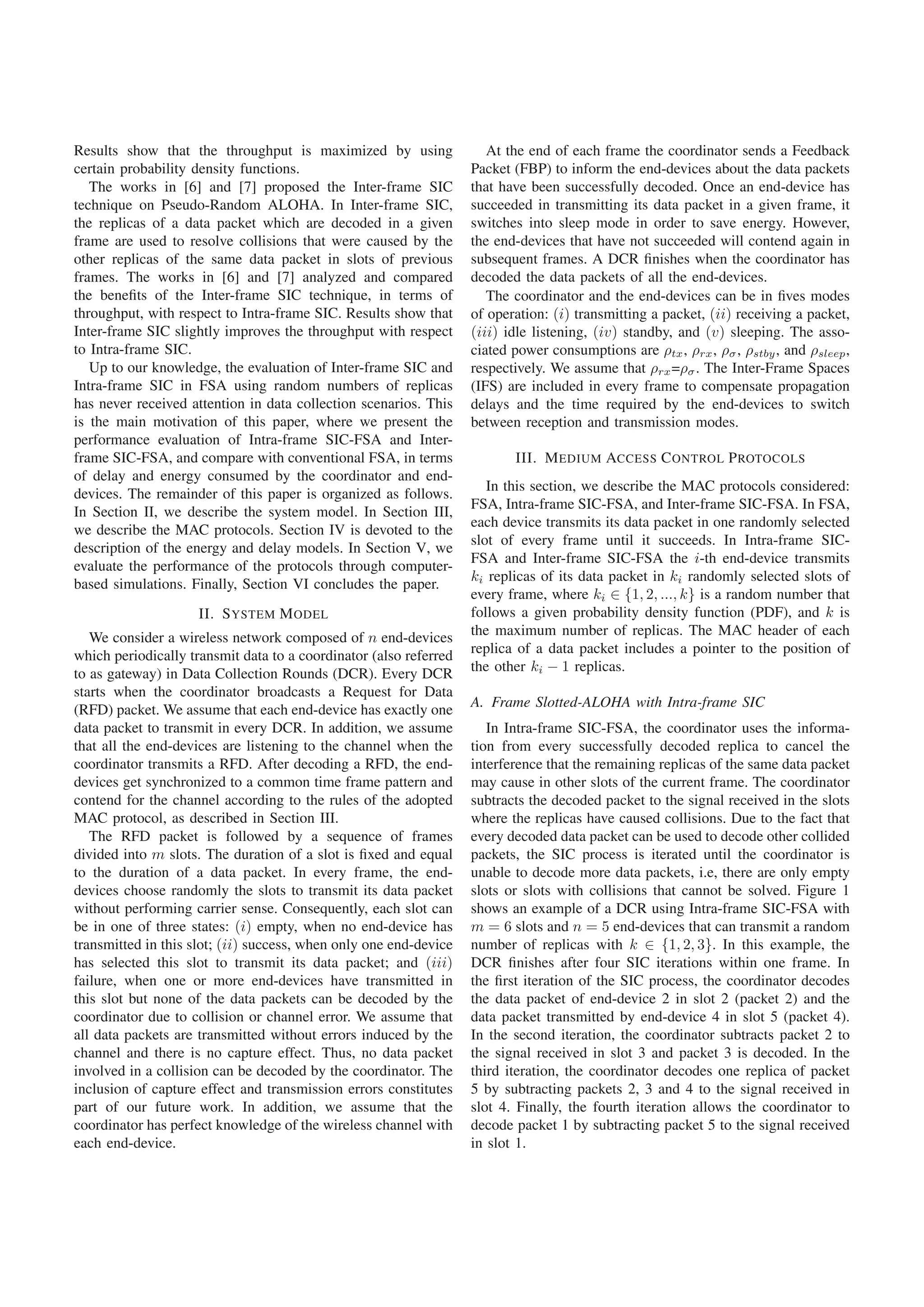 This document evaluates the performance of two Medium Access Control (MAC) protocols based on Frame Slotted-ALOHA (FSA) with Successive Interference Cancellation (SIC) for Machine-to-Machine networks: Intra-frame SIC-FSA and Inter-frame SIC-FSA. Through computer simulations, it compares the average delay and energy consumption of the two protocols to conventional FSA. Results show that Intra-frame SIC-FSA can reduce average delay by 78% and energy consumed per device by 18%, while Inter-frame SIC-FSA reduces average delay by 94% and energy consumed per device by 22%.