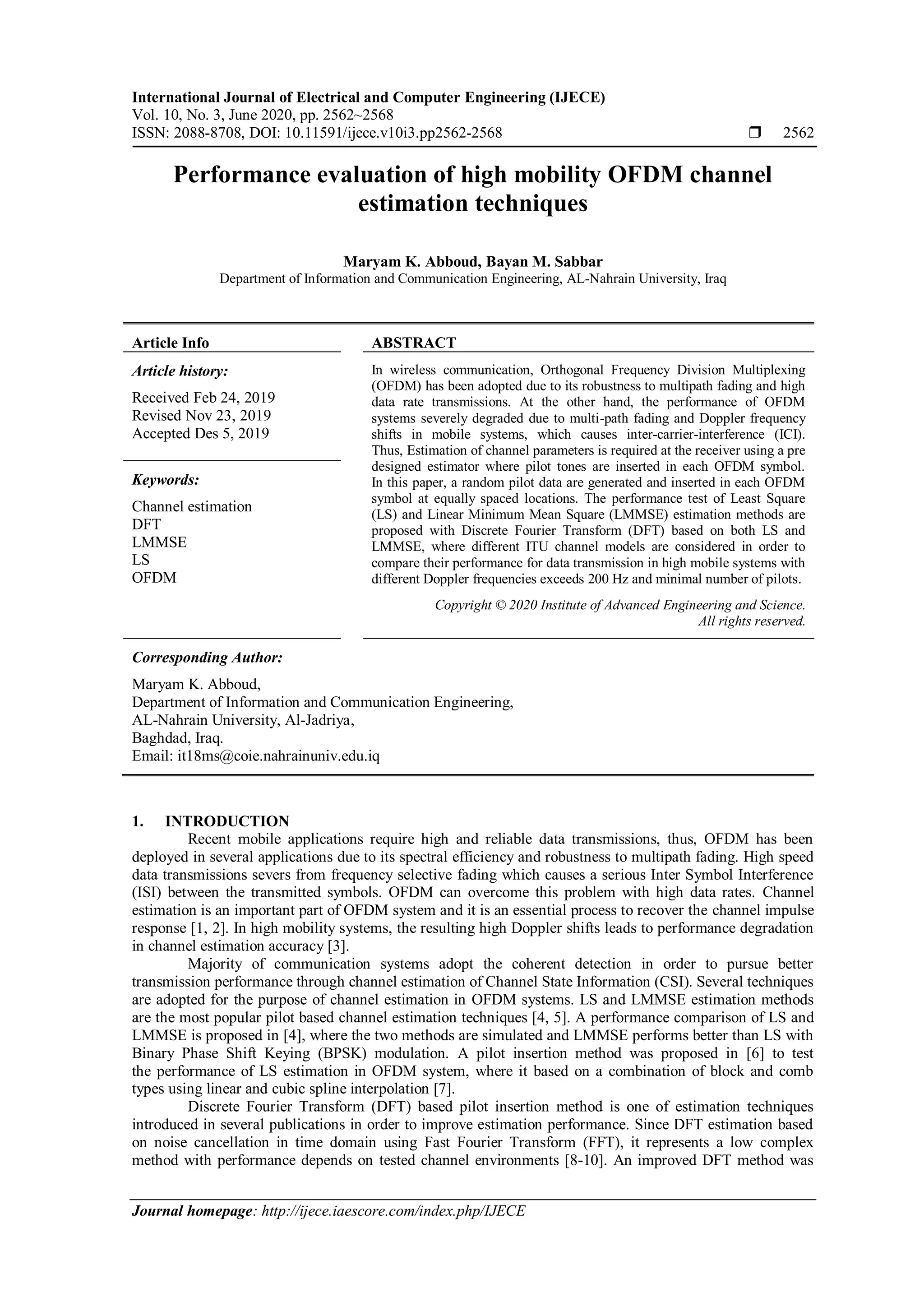 The document evaluates high mobility channel estimation techniques for orthogonal frequency division multiplexing (OFDM) systems, particularly under conditions of multipath fading and Doppler shifts. It compares the performance of least square (LS) and linear minimum mean square (LMMSE) estimation methods using Discrete Fourier Transform (DFT) across various channel models and Doppler frequencies. Results indicate that while LMMSE generally outperforms LS, the use of DFT-based methods can provide significant improvements, especially in high mobility environments.