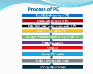 This document provides an overview of performance evaluation (PE) concepts and processes. It defines PE, discusses its purposes, and outlines the key steps in conducting PE. Some common PE methods are described, including graphic rating scales, multiple choice, and MBO. The document emphasizes developing objective criteria and standards to evaluate employees fairly. It also notes potential evaluator biases and suggests designing separate PE forms and procedures tailored for different employee groups.