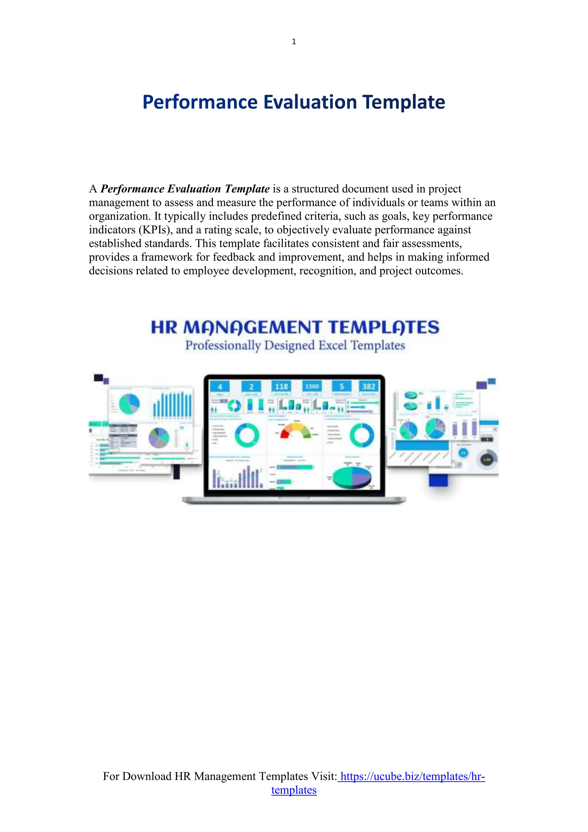 The document outlines a performance evaluation template used in project management to assess individual and team performance based on predefined criteria, including goals, key performance indicators (KPIs), and a rating scale. It emphasizes the benefits of consistency, transparency, and improved performance while providing steps for creating the template and best practices to follow. Additionally, it highlights common mistakes to avoid in the evaluation process.