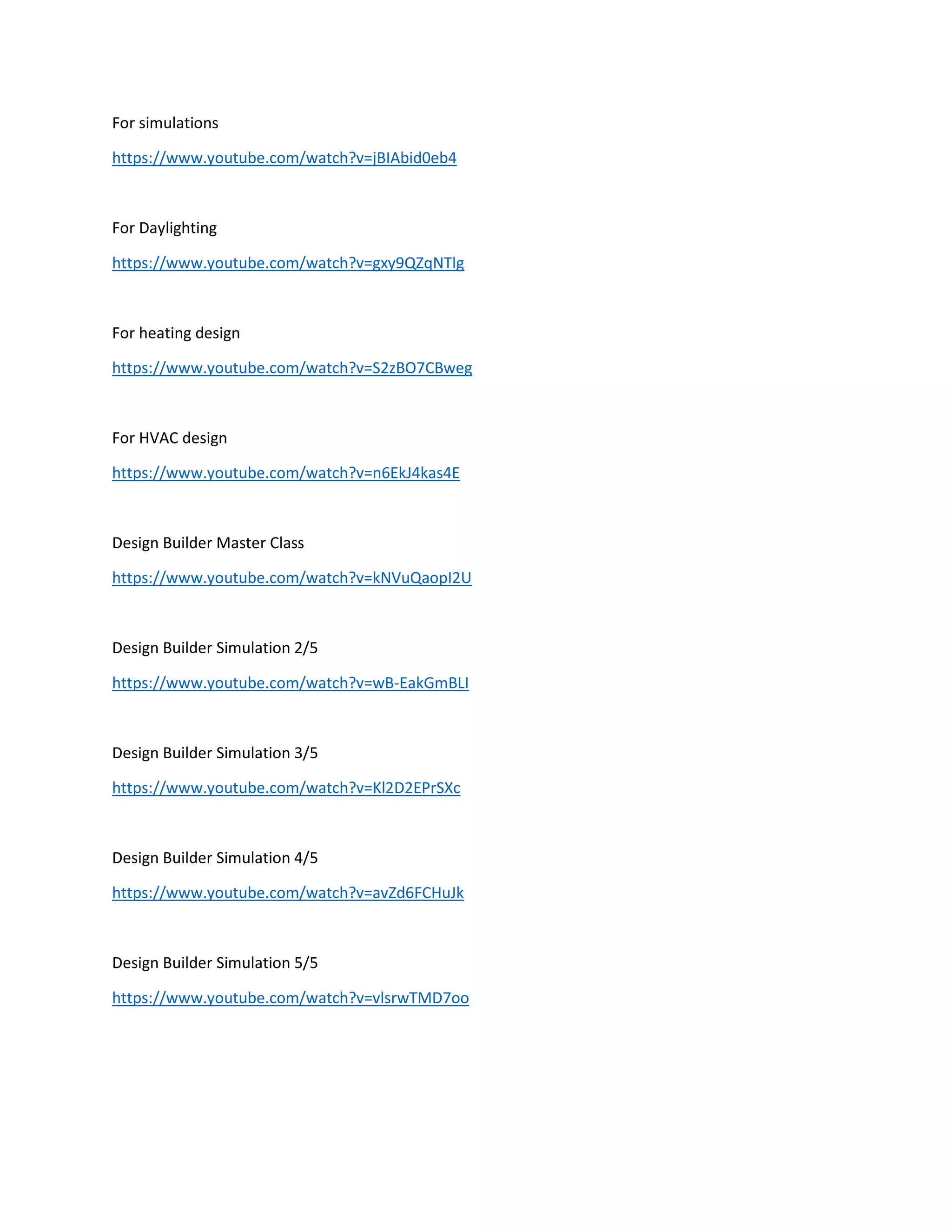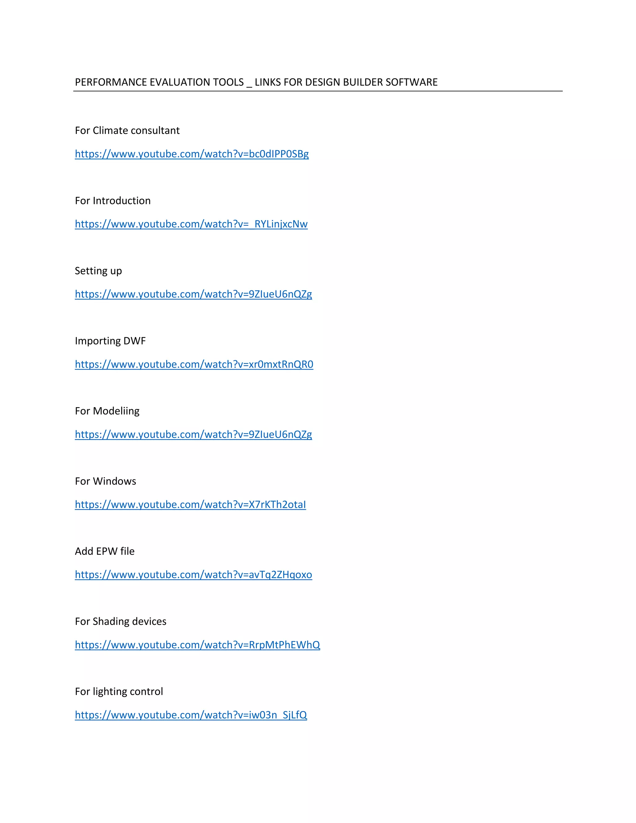 The document provides links to YouTube videos that demonstrate how to use various tools and features in Design Builder software. The links cover topics like setting up the software, importing files, modeling, adding windows and shading devices, lighting and HVAC design, simulations, and master classes on using Design Builder for performance evaluation.