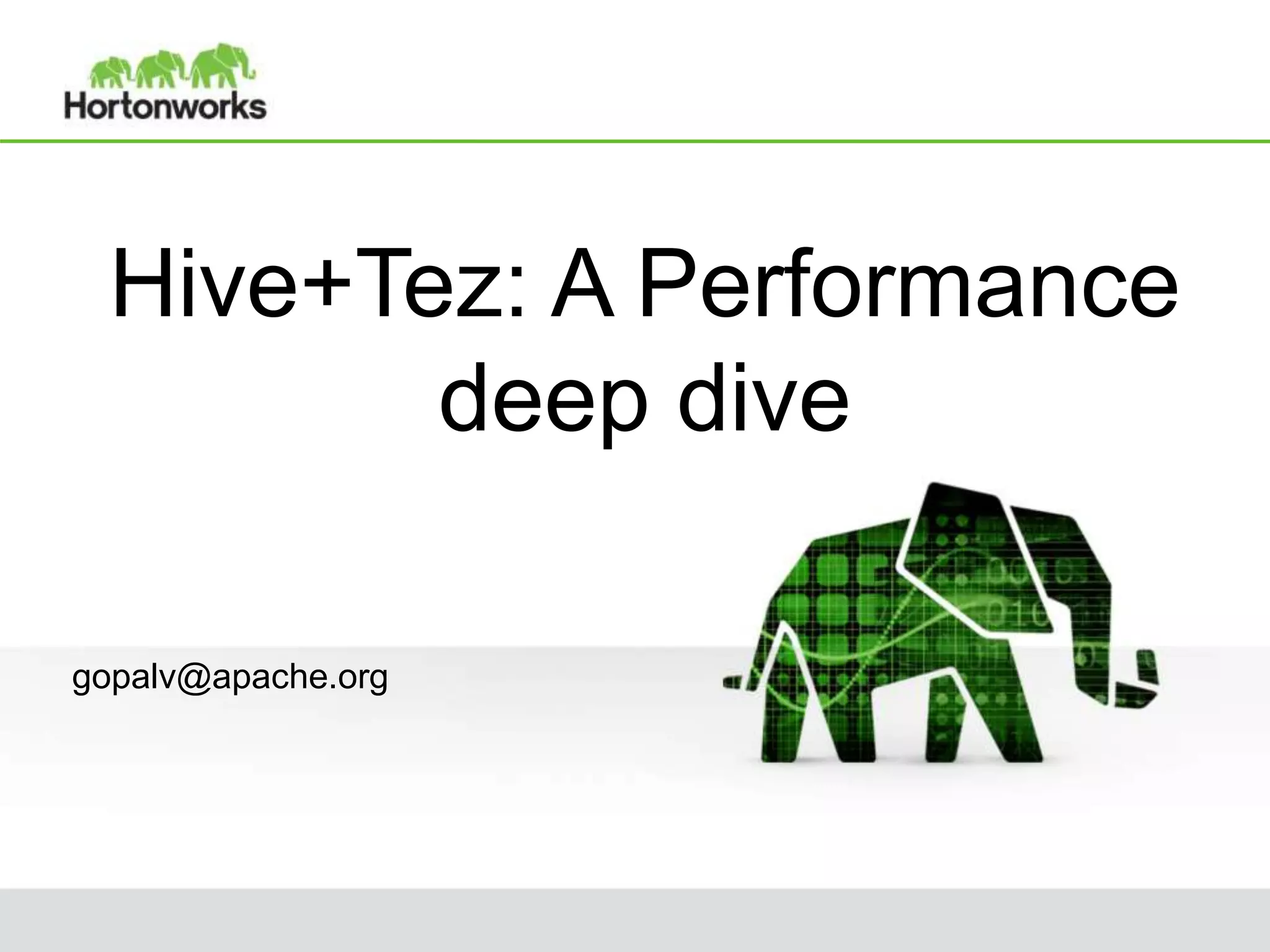 This document provides an overview of performance improvements in Hive through the use of Apache Tez and other optimizations. Some key points discussed include: