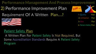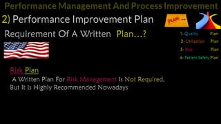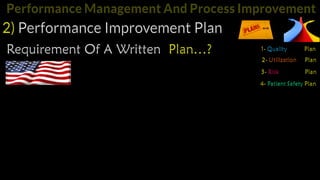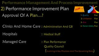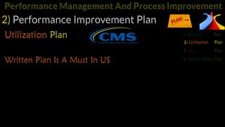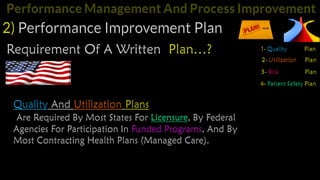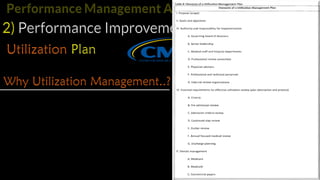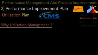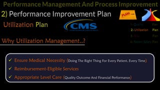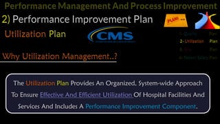 This performance improvement plan aims to set direction and tone for overseeing utilization and bed management. It impacts both quality and clinical risks associated with care delivery. The plan involves physician leadership, administration, and staff charged with overseeing and carrying out the plan.