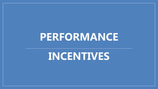 This document discusses various types of performance incentives used by companies. It begins by stating that incentives are reward systems that tie pay to performance, and are very common among organizations. It then provides details on different incentive systems, including: piece rate systems, where pay is based on individual output; individual bonuses for accomplishing goals; merit pay involving permanent raises for past performance; sales commissions as a percentage of sales; awards and recognition for going above expectations; team bonuses based on group performance; gainsharing programs that reward cost savings; profit sharing of company profits with all employees; and stock options giving employees the right to purchase company stocks. It concludes by asking questions about why incentives are important and what types would be implemented in one's own company