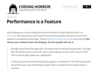 The document discusses the importance of performance in software development, emphasizing its significant impact on user experience and operational costs. It provides strategies for measuring and optimizing performance, such as identifying bottlenecks, using micro-benchmarks, and understanding garbage collection. Additionally, it shares lessons learned from various programming practices to enhance performance in managed codebases.
