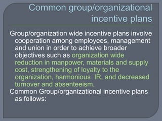 This document discusses common group and organizational incentive plans including gain sharing plans, profit sharing plans, cafeteria plans, and employee stock ownership plans (ESOPs).