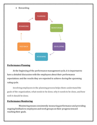 Performance management is an ongoing process aimed at setting objectives, assessing progress, and providing coaching to help employees achieve their goals. The 360-degree appraisal method is recommended for collecting performance data from various stakeholders, focusing on developmental areas, and guiding training programs. Key implementation steps include planning, monitoring, developing, reviewing, and providing feedback to enhance overall company performance and employee satisfaction.