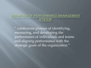 The document discusses performance management and outlines its key purposes and processes. Performance management is defined as the continuous process of identifying, measuring, and developing employee performance to align it with organizational goals. It serves strategic, administrative, communication, developmental, and organizational maintenance purposes. The performance management process involves performance planning, ongoing feedback, employee input, evaluation, and review. It should also include developing future goals, training managers, measuring appraisal quality, resolving poor performance, and ensuring consistency across the organization.