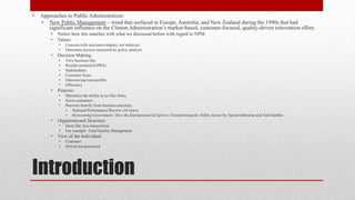 The document discusses approaches to performance management in public administration. It describes New Public Management, which borrows concepts from business like customer focus, efficiency, and outsourcing. The Results Oriented Approach shifts the focus to outcomes and productivity. Reinventing Government initiatives under Clinton sought to apply business standards to government through ideas like customer service, productivity measurement, and benchmarking. Subsequent reforms aimed to further connect plans, programs and performance reporting to improve accountability. However, some scholars argue for a New Public Service approach that values democracy, citizenship and public service over market-driven reforms.