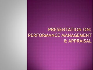 This document discusses various methods for performance appraisal and management. It defines performance appraisal as evaluating an employee's past and current performance relative to standards, and performance management as the process of ensuring employees work towards organizational goals. Several appraisal methods are described, including graphic rating scales, forced distribution, and behaviorally anchored rating scales. Challenges with appraisals like unclear standards and halo effects are also mentioned. The role of appraisals in career planning, correcting deficiencies, and salary decisions is noted.