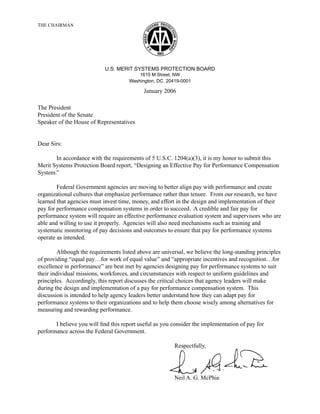This document is a report from the U.S. Merit Systems Protection Board (MSPB) that provides guidance to agencies on designing effective pay for performance compensation systems. The report discusses key decision points agencies must consider, such as determining goals, coverage, performance measures, and reward structures. It emphasizes that there is no single right approach and agencies must tailor systems to their unique needs and cultures. However, the report also identifies critical common factors for success, such as a supportive culture, well-trained supervisors, rigorous performance evaluations, adequate funding, and checks and balances to ensure fairness. The MSPB recommends agencies make substantial investments in these areas and stresses that performance evaluation is the foundation on which an effective pay for performance system