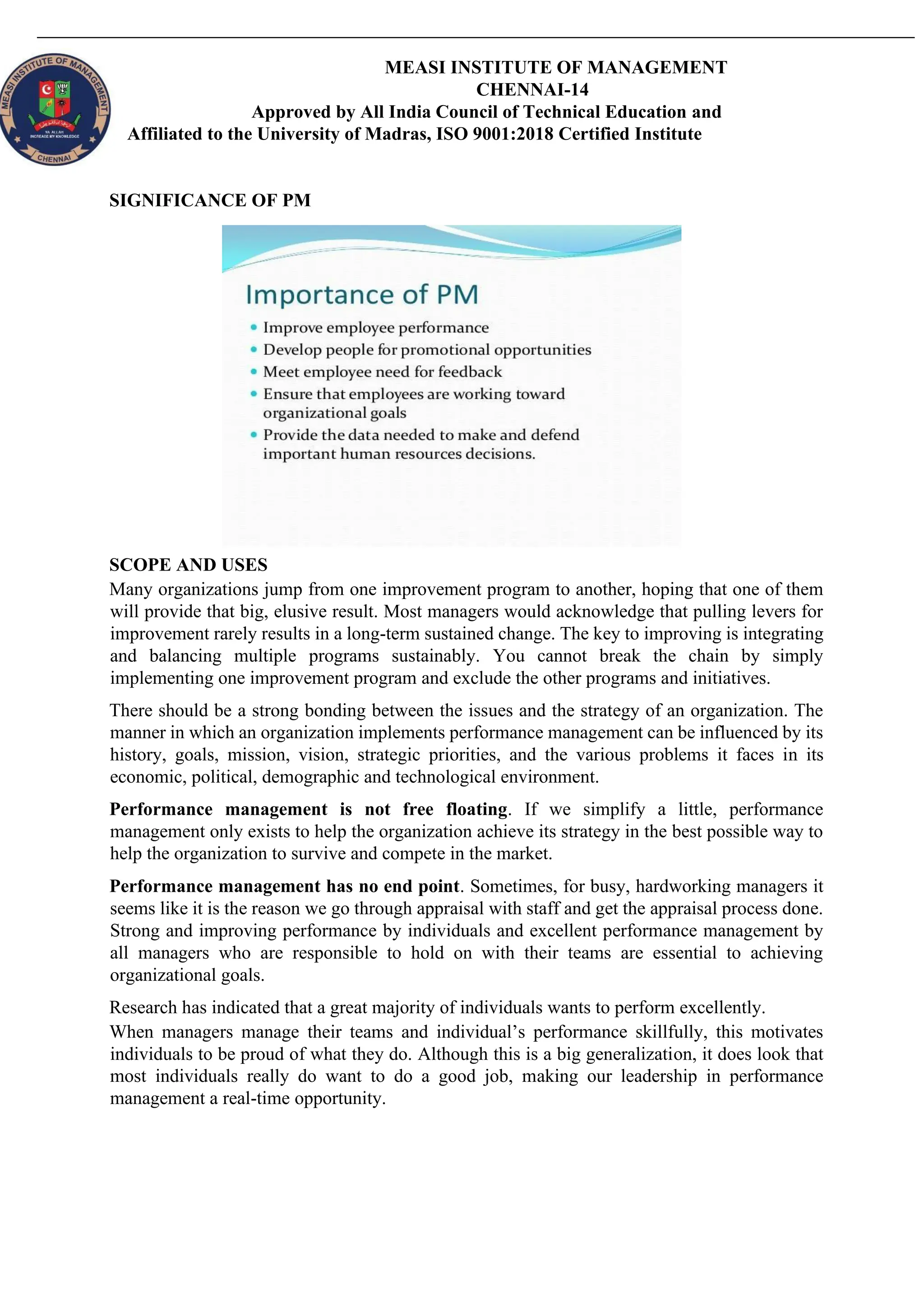 This document discusses performance management at Measi Institute of Management in Chennai. It defines performance management as a systematic process to improve organizational performance by developing individual and team performance. The key points are: