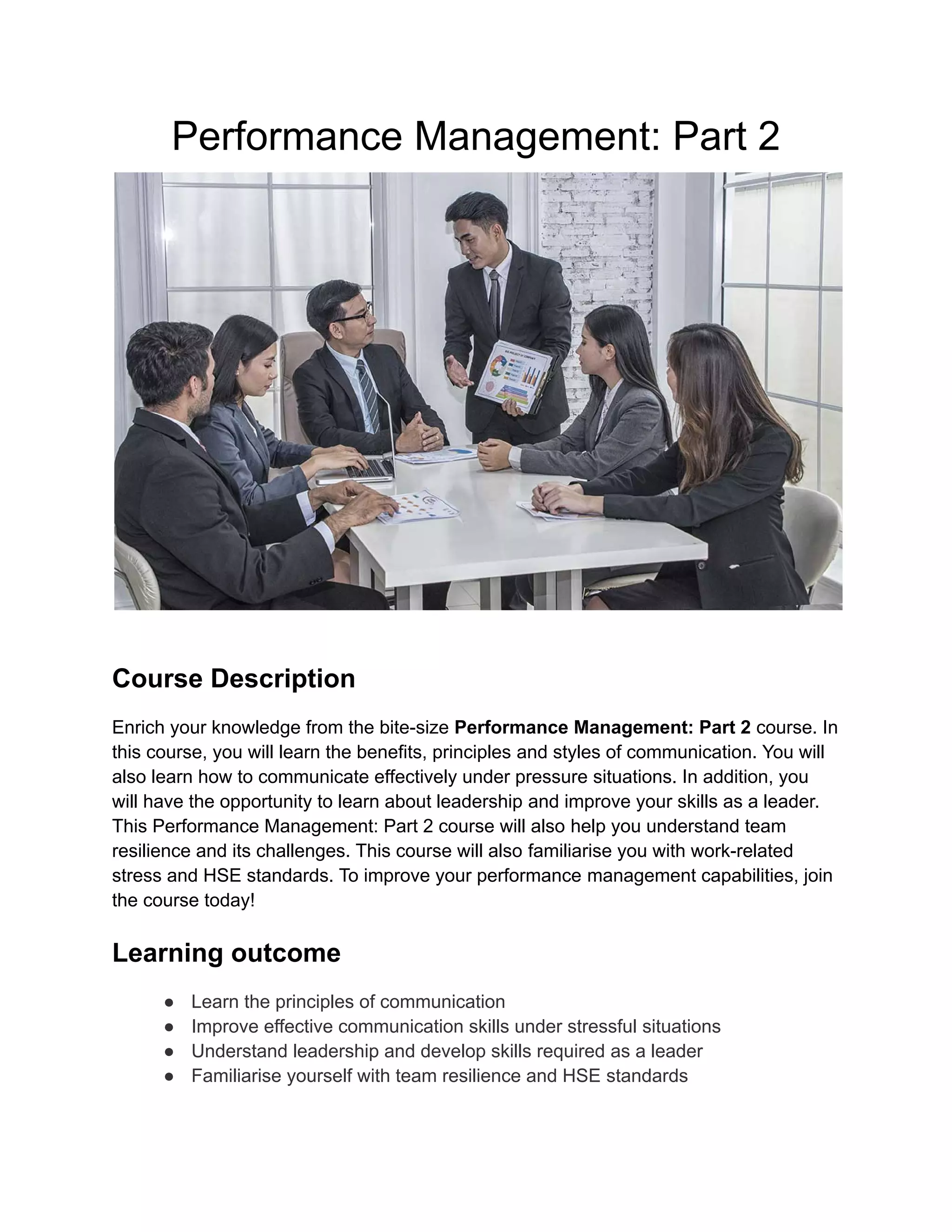 The Performance Management: Part 2 course enhances skills in communication, leadership, and team resilience, especially under pressure. Participants will learn key principles of effective communication and the challenges of work-related stress and HSE standards. The course is accessible on any device and available anytime, making it convenient for learners.