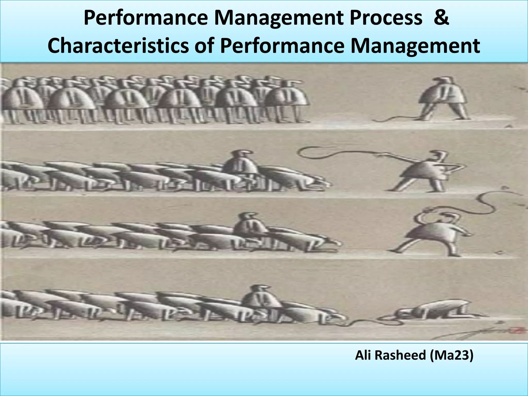 The document defines performance management as a strategic approach to improving employee performance and developing capabilities through ongoing partnerships between supervisors and employees. It outlines the performance management process, including assessing skills, providing feedback, and setting responsibilities for supervisors and employees. The document also describes characteristics like being congruent with organizational strategy and identifying effective and ineffective performance.