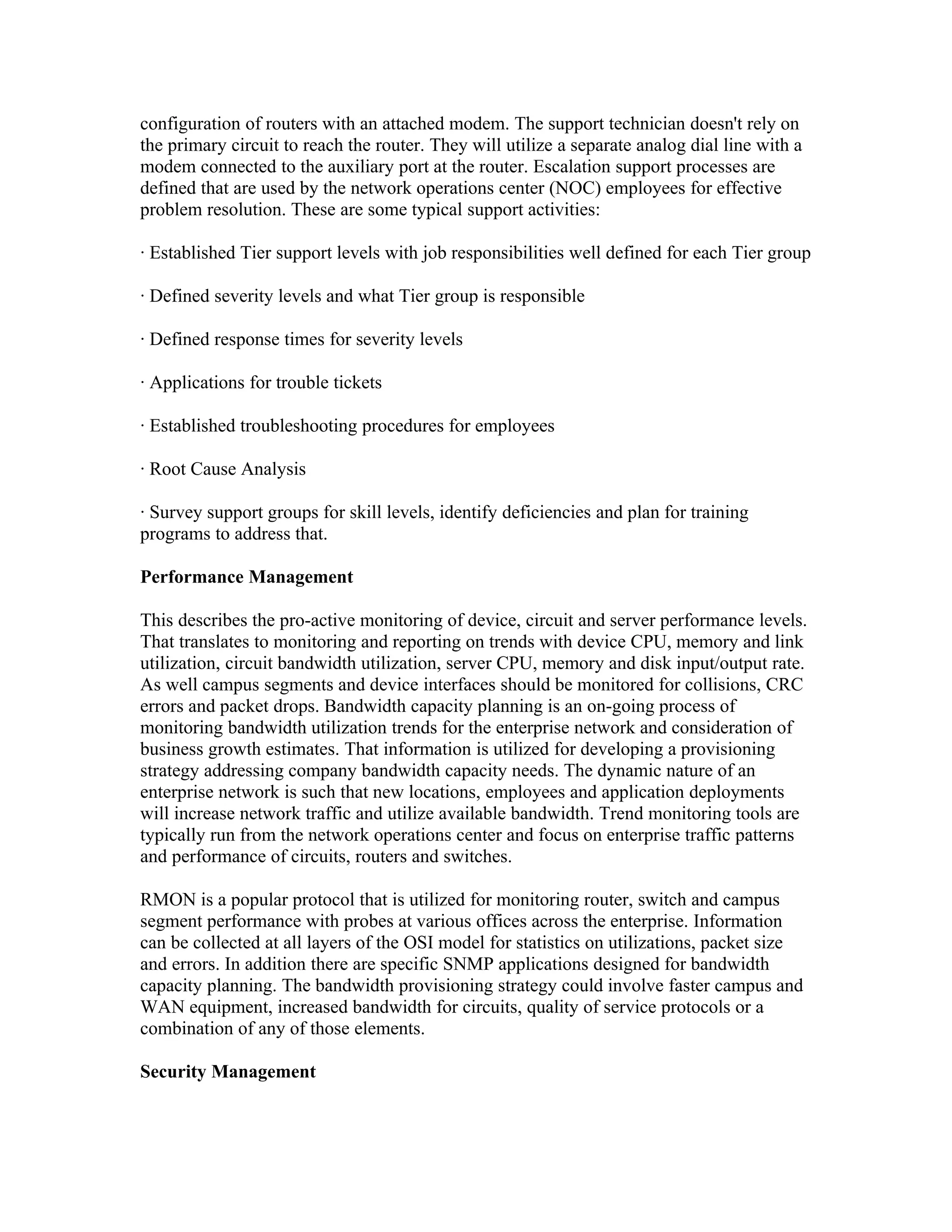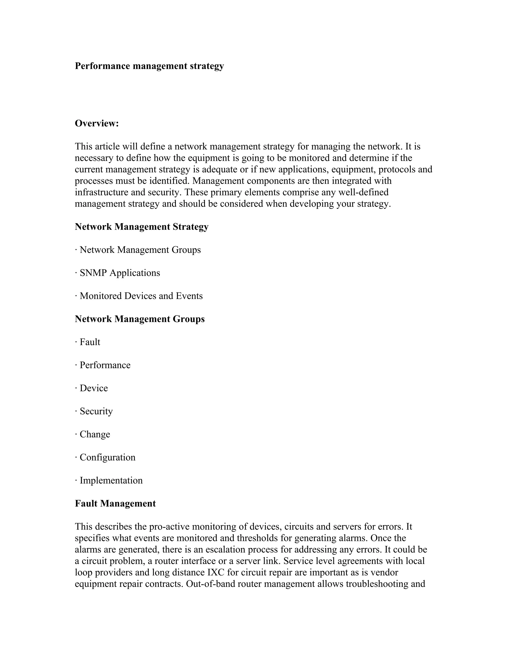 This document outlines a performance management strategy for monitoring a network. It discusses establishing network management groups to monitor faults, performance, devices, security, changes, configurations, and implementations. It also describes monitoring devices and circuits, using SNMP applications to set thresholds and polling intervals for events. Fault management, performance management, and other elements are covered to provide a well-defined management strategy.