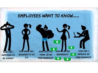 The document discusses effective performance management systems, outlining that they should align with organizational strategy and culture, be practical and easy to use, and monitor both results and behaviors. It also provides details on the key aspects of a performance management cycle including planning, monitoring, and reviewing performance. Guidelines are presented for setting goals for employees using the SMART framework and providing constructive feedback.