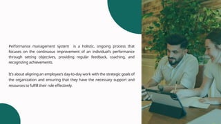 The document outlines the importance of a performance management system that focuses on continuous improvement through goal-setting, feedback, and recognition. It also discusses several determinants affecting performance, such as skills, motivation, work environment, and organizational culture, while highlighting potential obstacles like poor communication and biases in performance appraisal. Additionally, it emphasizes the human resource responsibilities in recruitment, training, and compliance, along with the legal considerations surrounding fair and unbiased performance evaluation.