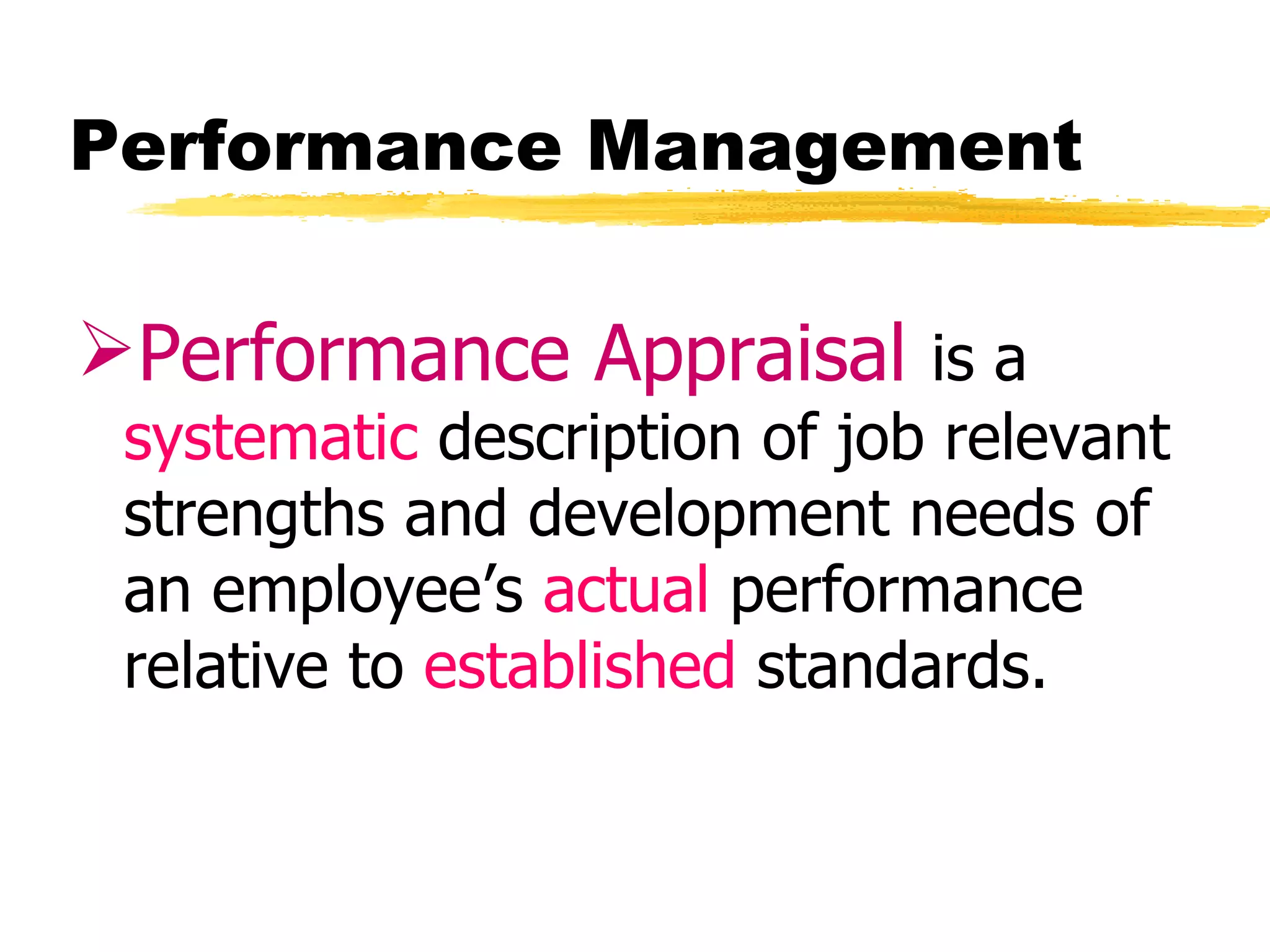 Performance management involves systematically evaluating employee job performance and providing feedback to improve performance. It includes performance appraisals that measure performance relative to standards, as well as developmental feedback. Effective performance management benefits employees through improved performance, fairness, and motivation. It also provides administrative benefits to organizations and legal protections when implemented properly.