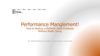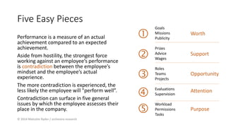 The document discusses how contradictions between employees' mindsets and their experiences at work can hinder performance. It identifies 14 aspects of organizational support that can either reinforce or undermine employee expectations, mobility, and credibility. Mistakes made in addressing these aspects can lead to negative perceptions and disengagement from employees.