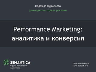 Документ посвящен аналитике и конверсии в области перформанс-маркетинга. Рассматриваются метрики, такие как CPA, CPL и ROI, а также важность корректной настройки систем аналитики для понимания эффективности рекламных кампаний. Приведены примеры расчета ключевых показателей и подчеркивается необходимость тщательного анализа для оптимизации результатов.
