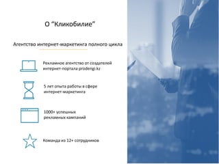 Документ представляет собой презентацию агентства интернет-маркетинга с акцентом на разнообразные каналы и инструменты цифрового маркетинга, включая CPA, CPL и CPC. Также он содержит примеры успешных кейсов и стратегий, направленных на повышение конверсии и эффективности рекламных кампаний. Основное внимание уделяется аналитике и автоматизации процессов для интернет-магазинов и социальных сетей.