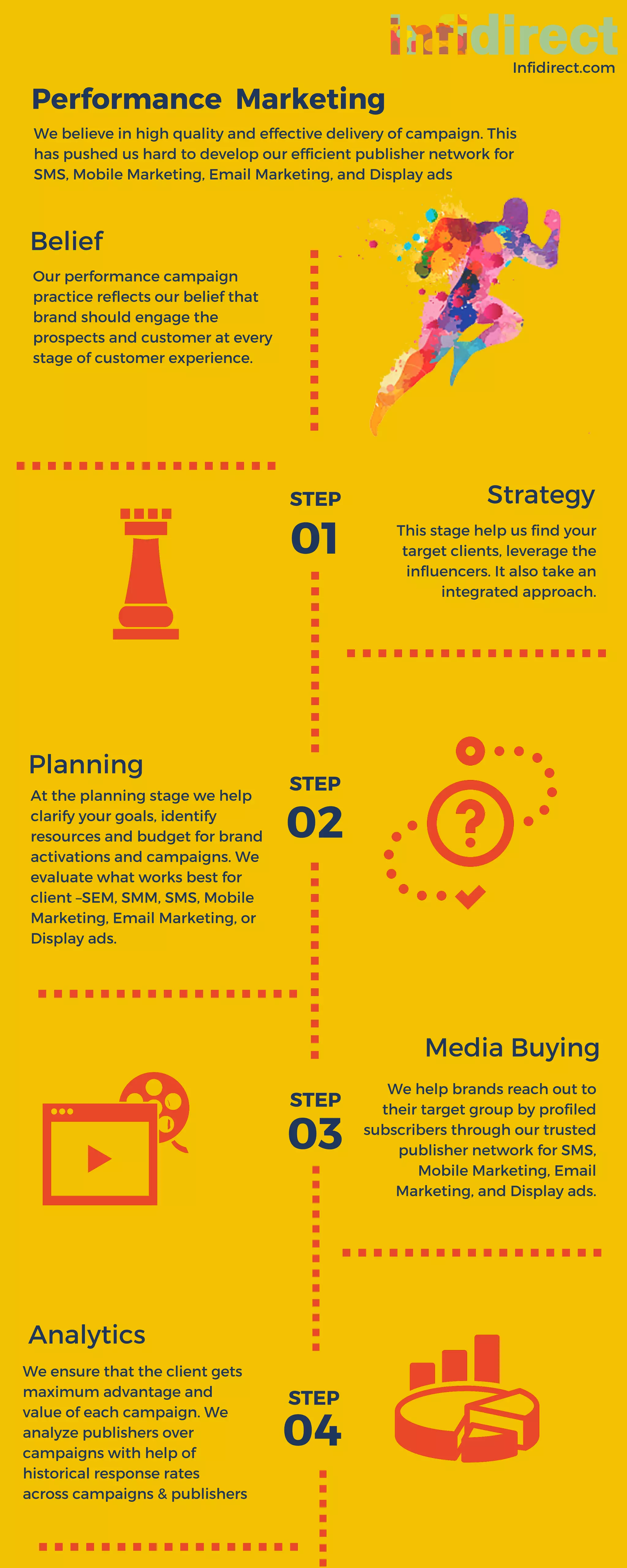 The document discusses the stages of a performance marketing campaign including planning, media buying, and analytics. In the planning stage, goals and budgets are established and the best marketing channels like SEM, SMM, and email are identified. Media buying involves using a publisher network to reach targeted subscribers through SMS, mobile, email, and display ads. Analytics ensures maximum value by analyzing publisher performance across campaigns using historical response rates.