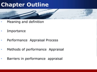 This document outlines different aspects of performance appraisal systems including definitions, importance, processes, methods, barriers, and limitations. It discusses the purposes of performance appraisal including development, feedback, administrative decisions, organizational maintenance, and legal requirements. Common methods described are ranking, paired comparison, forced distribution, graphic rating scales, MBO, BARS, assessment centers, and 360-degree/720-degree feedback. Barriers mentioned are personal bias, halo/horn effects, lack of standards, stress on individuals over performance, and lack of communication.