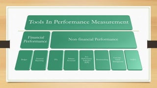 Performance measurement in the public sector aims to increase transparency and accountability. It involves quantifying the effectiveness and efficiency of programs and processes using various tools. Some key challenges include linking outputs to outcomes, comparing measures across different programs, and quantifying qualitative objectives. Additionally, a large proportion of costs are not easily traced to outputs and outcomes, and balancing comprehensive versus concise performance reporting can be difficult. Overall, performance measurement in the public sector faces greater challenges than the private sector due to multiple objectives rather than pure profit-focus.