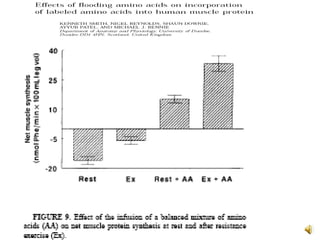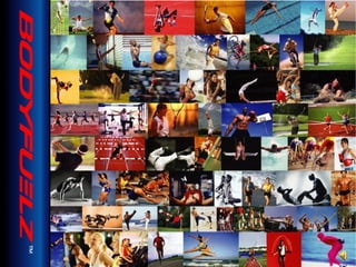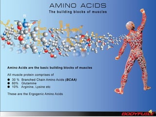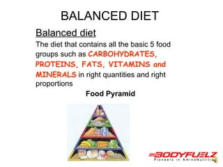 The document discusses balanced nutrition and macronutrients needed for performance and muscle building. It provides details on carbohydrates, proteins, fats, vitamins, and minerals. It also discusses calculating basal metabolic rate and daily calorie needs. The key aspects are a balanced diet containing the right proportions of macros, sufficient calories for goals, and proper recovery nutrition including protein and amino acids to prevent muscle breakdown.