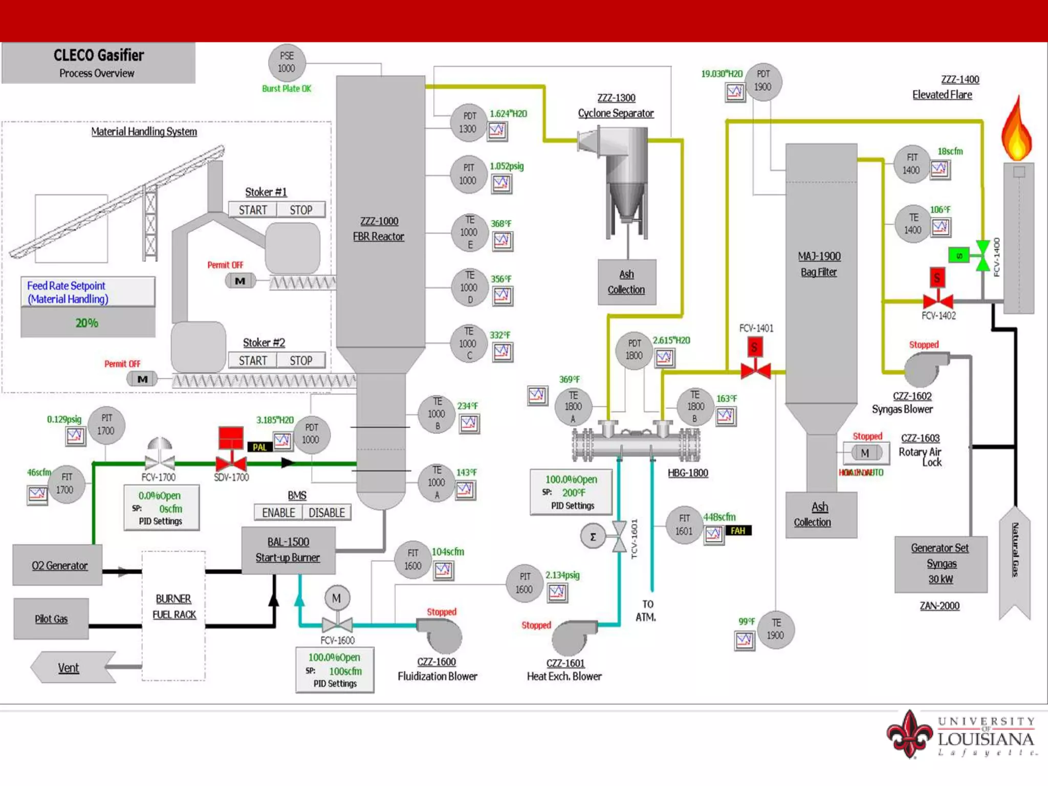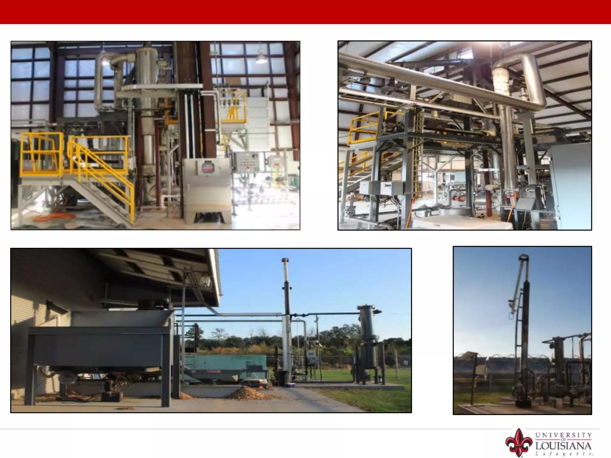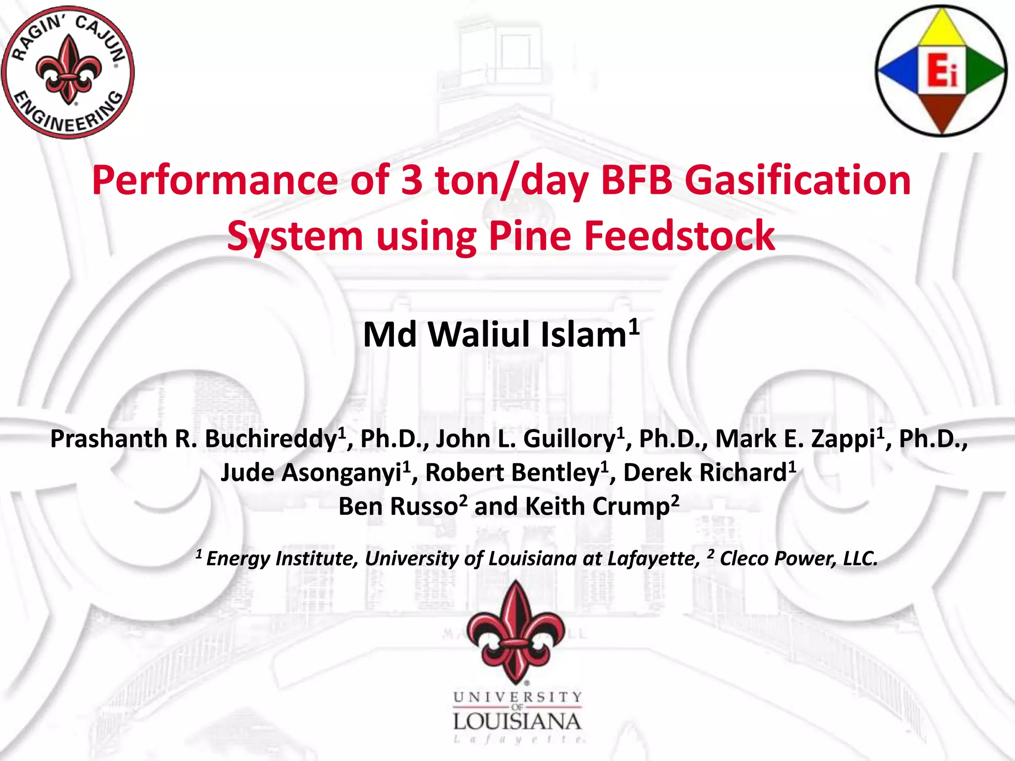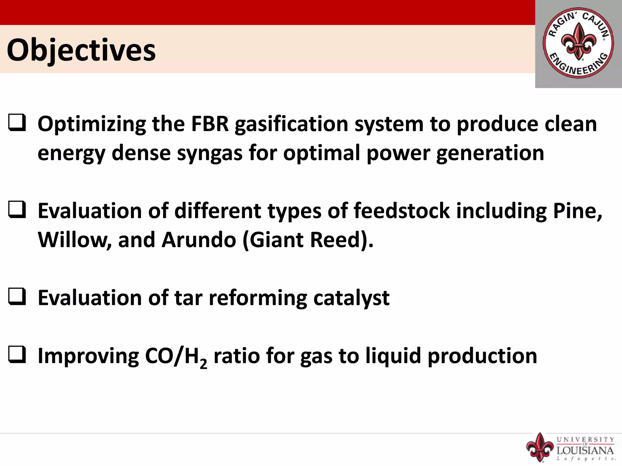 1. The document summarizes the performance of a 3 ton/day bubbling fluidized bed gasification system using pine wood chips as a feedstock. 2. Key findings include hydrogen production and heating value of the product gas increasing with higher bed temperature, while gas production and efficiencies increase with higher equivalence ratio. 3. Future goals are listed as installing tar reforming, testing steam/oxygen gasification, and using bed catalysts to improve syngas quality.