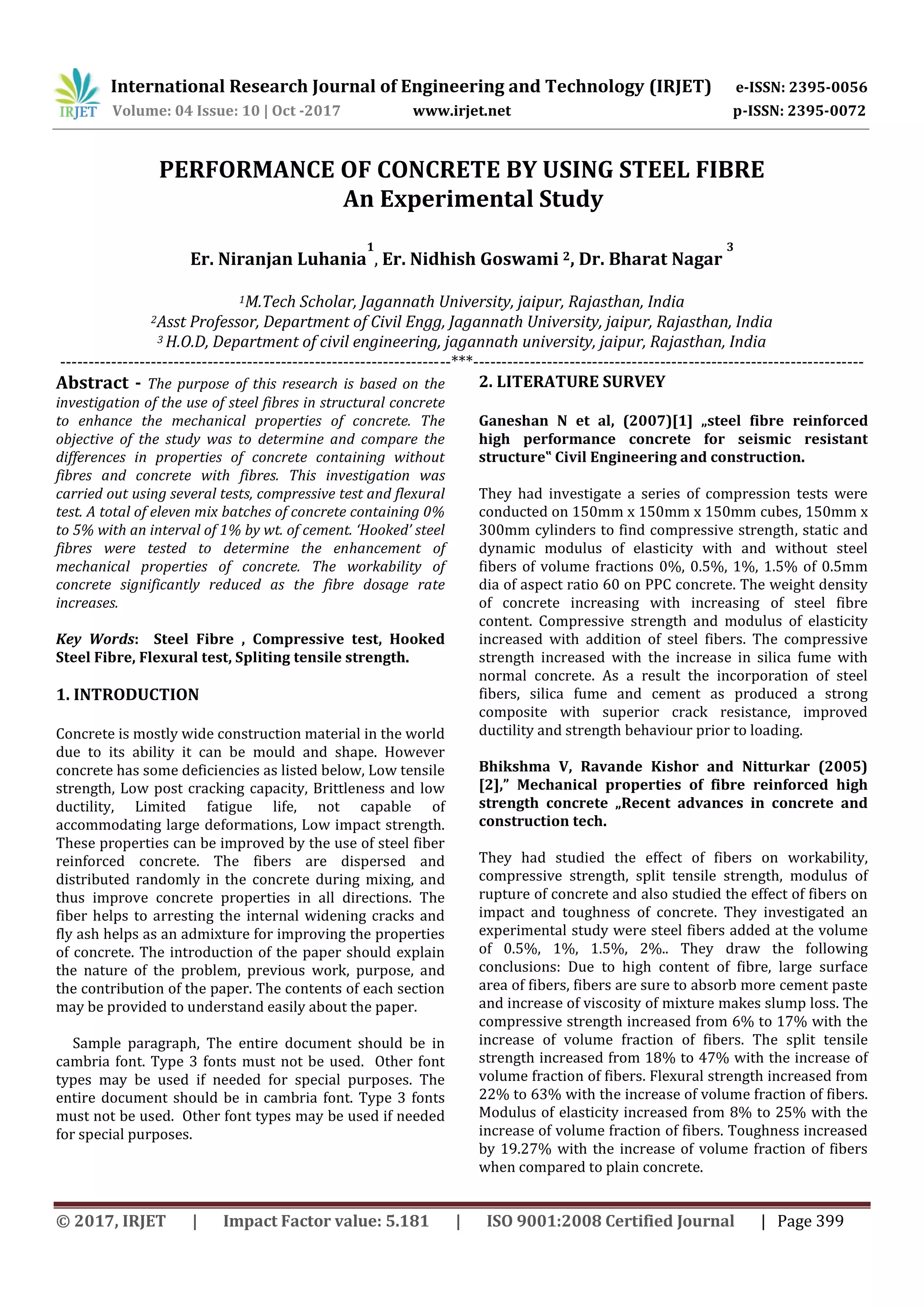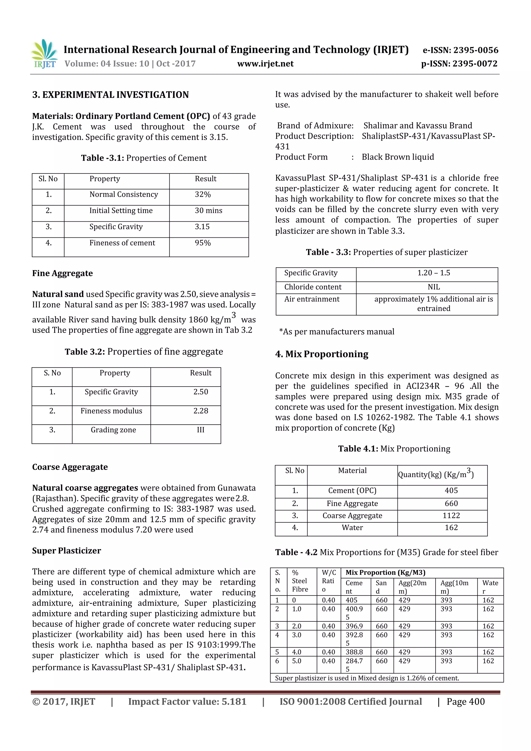 This document presents the results of an experimental study on the effect of adding steel fibers to concrete at percentages ranging from 0% to 5% by weight of cement. Tests were conducted to determine the compressive strength, flexural strength, and split tensile strength of concrete cubes, beams, and cylinders respectively containing different amounts of steel fibers. The results showed that the addition of steel fibers led to improvements in all the measured mechanical properties of the concrete with maximum strengths obtained at around 3-4% fiber content. The density of the concrete also increased with higher fiber percentages while the workability decreased requiring the use of a superplasticizer.